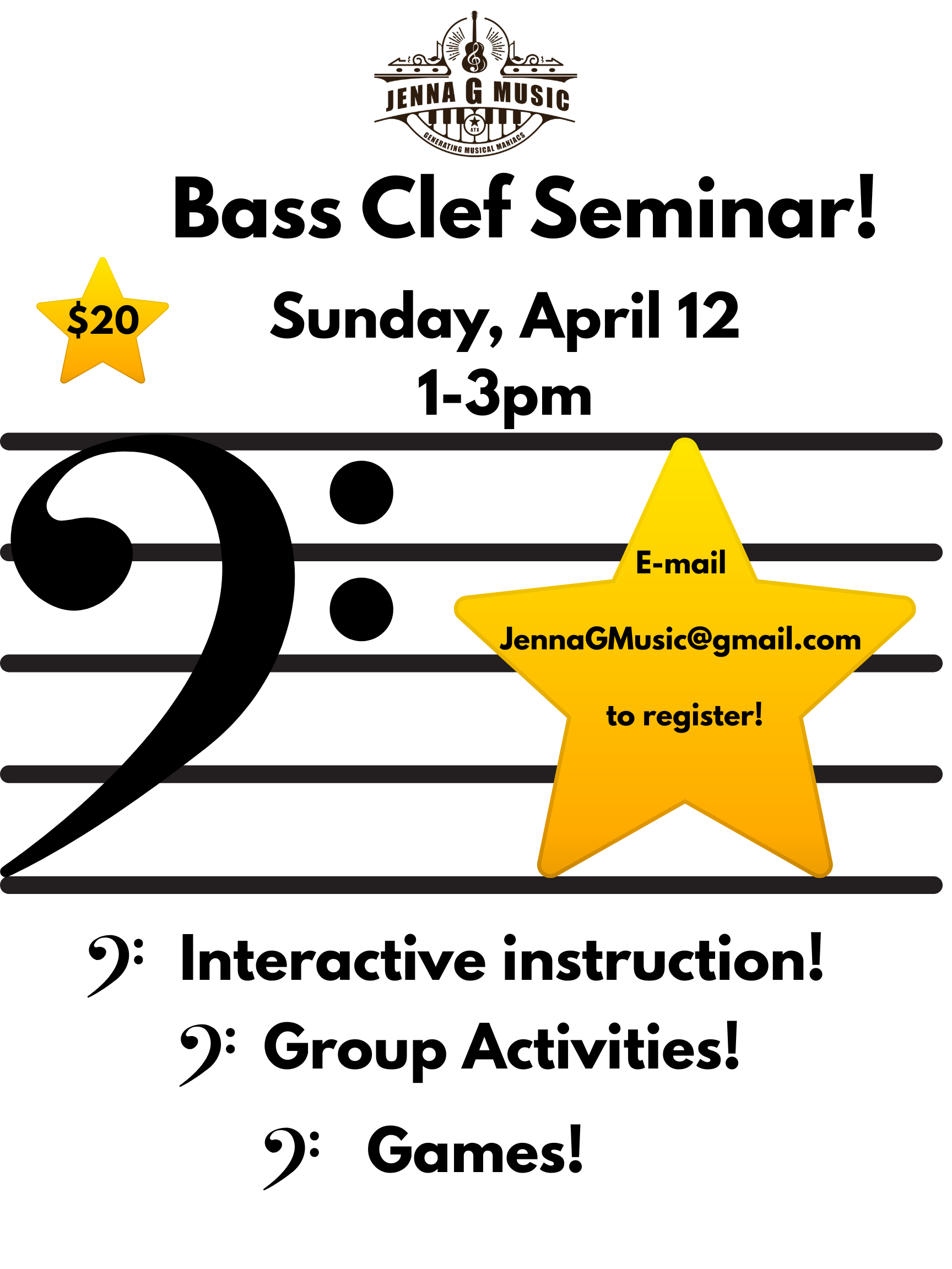Bass Clef Note Reading Seminar Sunday, April 12, 2026 1:00 PM 3:00 PM 13:00 15:00 Google Calendar ICS